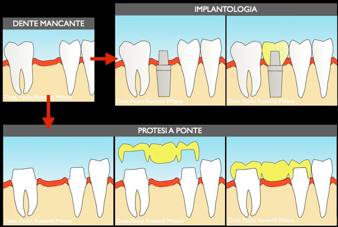 La protesi a ponte e la protesi su impianto sono due alternative valide per la sostituzione di un dente mancante.