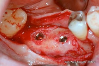 Rigenerazione ossea verticale in mandibola. Gli impianti vengono inseriti in mandibola parzialmente esposti. Successivamente si applica l’innesto. A distanza di 6 mesi le viti implantari risultano sommerse nel nuovo osso.